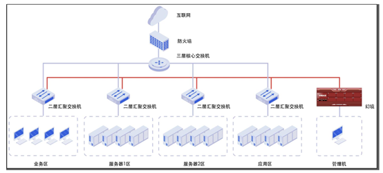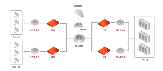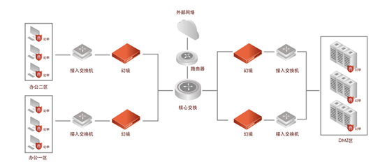 如圖所示: 采用幻境串接+幻甲的模式, 幻境串接在核心交換和接入交換之間, 貼近接入交換一側(cè), 幻甲安裝到辦公電腦和服務器中, 幻境幻甲聯(lián)動, 直接定位攻擊源, 動態(tài)封堵, 形成閉環(huán), 整個過程只需前期配置好, 后期運行時人工參與少。 該部署模式, 不僅可以防御來自外部的滲透, 同時可以防御來自內(nèi)部的滲透。